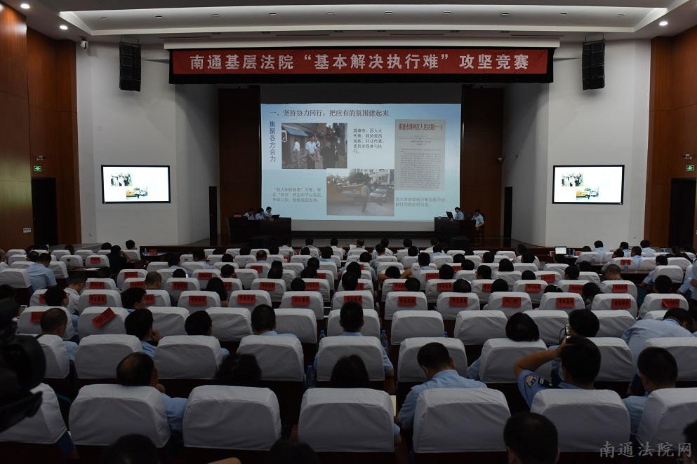 为鼓励先进,鞭策后进,传导压力,压实责任,根据省法院《关于在全省基层法院开展“基本解决执行难攻坚竞赛活动”的通知》,9月20日下午,南通中院组织全市基层法院开展“基本解决执行难攻坚竞赛活动”。南通9位基层法院院长现场汇报工作,接受点评提问,全国、省、市、县四级人大代表和政协委员作为评委,分别对各法院规范执行、阳光执行、执行质效、执行保障等情况当场打分并公布成绩。市中院党组书记、院长曹忠明参加活动并讲话,市中院院领导、各部门负责人、执行局全体干警,各基层法院院长、班子成员,全市各执行联席会议单位的代表共200余人现场观摩,见证南通法院历史上首次“院长级”竞技大赛。